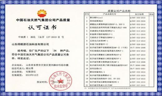 公司建立了先進完善的內(nèi)控體系和質(zhì)量控制體系,通過了API spec Q1及API 13A認證、ISO9001質(zhì)量管理體系認證、14001環(huán)境體系認證、18001職業(yè)安全健康體系認證、HSE健康安全環(huán)保體系認證和CNPC油田化學(xué)劑質(zhì)量認證。